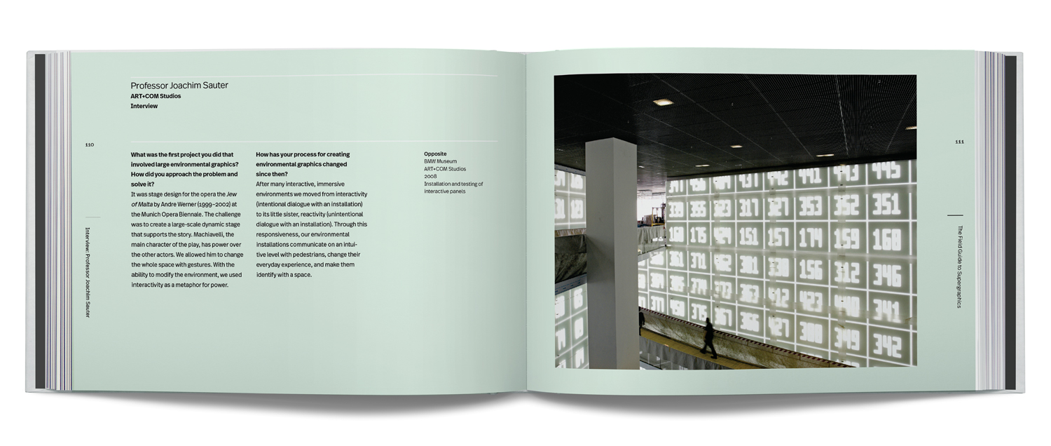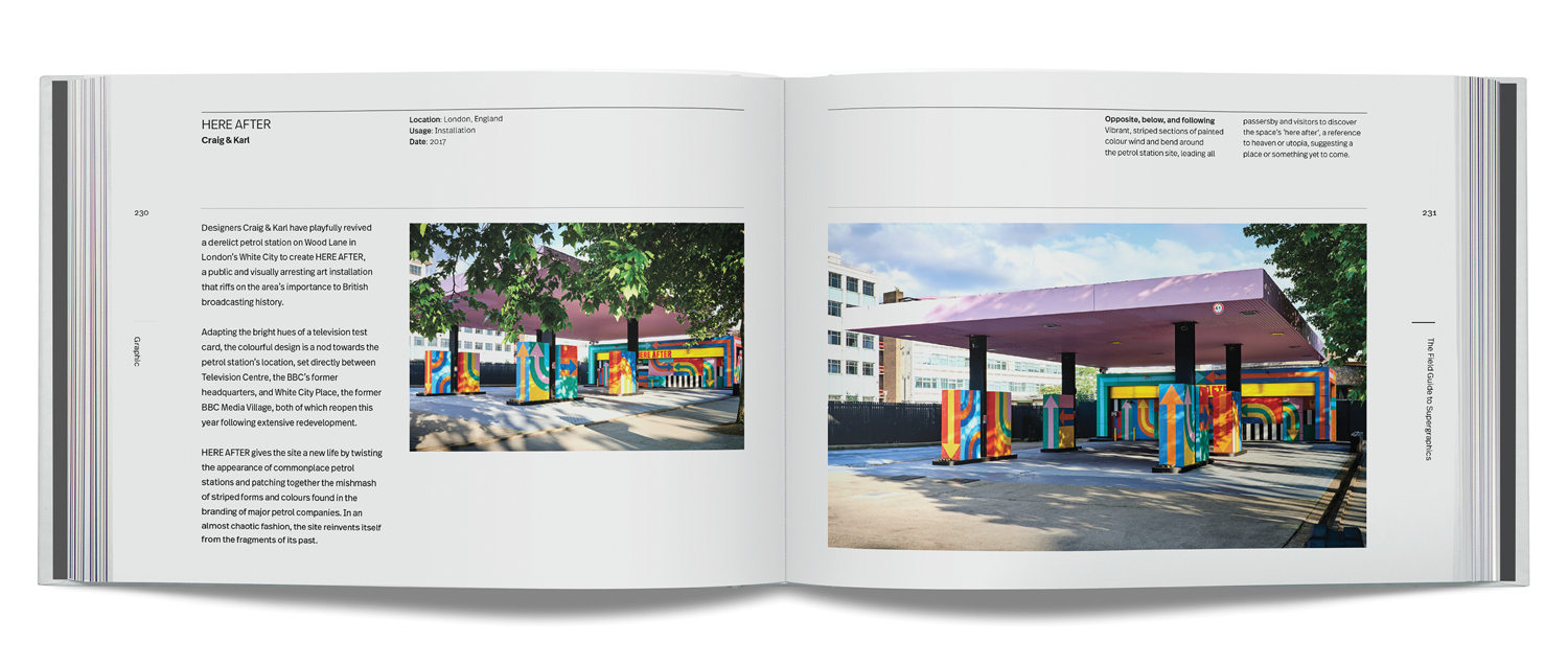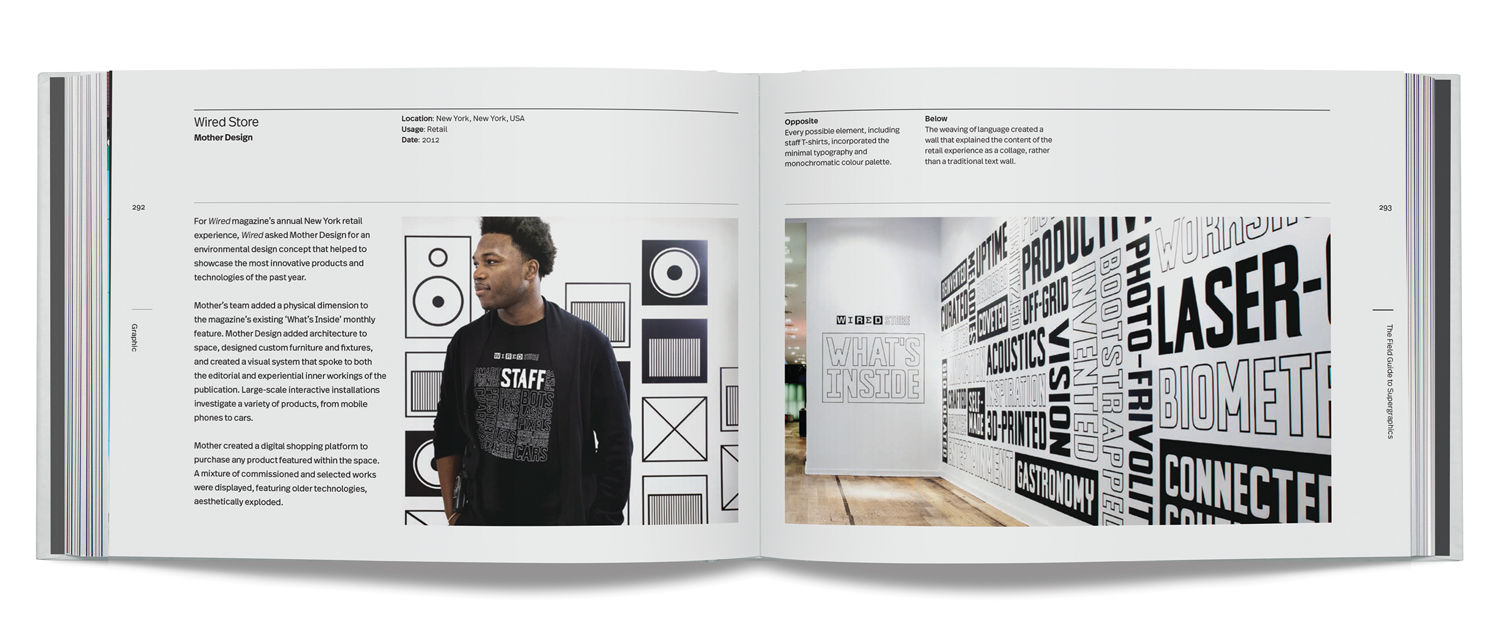 Digital technology now allows for interaction and screen-based media on a large scale. The audience can now actually communicate with an architectural space in a unique and personal manner. The difference between a large overwrought design on the wall and a successful supergraphic is typically based on three points: a strong concept, interaction with the architecture, light, and space, and relationship to the viewer. Many people can paint stripes on a wall, whereas a designer can use the entire volume, sense of place, and context, and change the environment to create a story with words, colour, and shapes. This book includes examples of the best supergraphics internationally. These are evidence of the sense of delight evoked when a beautifully crafted graphic solution, smart concept, and awareness of the community are combined.