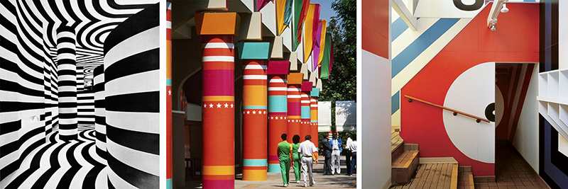 Today, we continue to use words, symbols, images, and forms as part of our built environment. We may not be telling the story of Hathor, Quetzalcóatl, or Moses, but we use design to bind communities, create branded spaces, help a visitor find the way, and create delight with colour and typography. Supergraphics were long considered an inferior form of communication, used on dull architecture to hide flaws, and in many instances, this is exactly what happened.. Large bands of coloured stripes adorned bland waiting rooms and municipal government offices in the 1970s. However, the definition of supergraphics has changed over the last twenty years. Once, only a large geometric design on a wall or building was a supergraphic. Today, the term encompasses architectural delineation, wayfinding and identifying signage, illustrative murals, and branding elements.