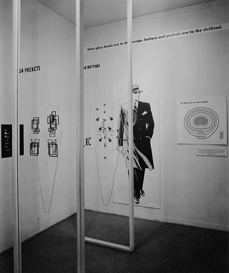Rudofsky’s “24 Pockets” installation appeared in an exhibition focused on menswear, a challenging topic since men’s clothing had been long associated with sobriety and understatement. While Rudofsky pilloried “the follies” of women’s wear with dispatch, juxtaposing artifacts with striking formal similarities across varied cultures and historic periods (comparing “primitive” tattooing with “modern” makeup, for example), Rudofsky employed diagrams to deflate perceptions that the suit was a near-perfect form. Printed on the wall was a life-sized image of a man in business attire, perfectly outfitted—a Dick Tracy-like figure with a broad-shouldered build and conventional good looks of the 1940s. He wears a Fedora hat and handles gloves with élan; a pristine handkerchief peeks from a coat pocket. An exemplar of sleek urbanity, the figure strides forward confidently, only to be interrupted by two adjacent floor-to-ceiling glass panels. The first diagrammed the pockets in successive layers of the masculine suit, and the second, the number of buttons. As MoMA explained in its press release, Rudofsky had created a “simulated X-ray examination” of the standard masculine uniform, one that picked up on “calcified” components of dress that seemed to have spread at alarming rates.