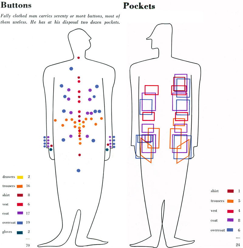 Pictured in Life magazine working on his installation while wearing the white lab coat of the scientist, Rudofsky frowns in concentration as he adjusts the rigid pocket-forms on his diagram. In keeping with the x-ray analogy, the diagram renders the soft, cloth pocket as preposterously rigid, as if “calcified.” If preposterous, Rudofsky’s x-ray faithfully demonstrated what we know about pockets: they come in pairs and singletons; they have different shapes and axial alignments; their placement shifts across the trunk with different articles of clothing; a preponderance congregates around chest and thighs and seem sensitive to handedness. Like any good object study, the installation compelled viewers to pause and reconsider a common thing and our relationship to it: what are we to make of our apparent fondness for pockets? Should we revise our picture of modern man, so seemingly self-possessed, if we acknowledge that he achieves his self-sufficiency with a panoply of concealed compartments—that the modern man is also a pocketed man?