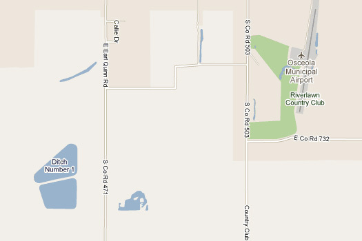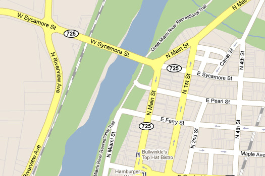 Fly with me now to Miamisburg, Ohio, home of the Miamisburg Indian Burial Mound, the Mound Golf Course, and the Mound Laboratory, operated by Monsanto Chemical Company, which produced bomb detonators and recovered tritium from nuclear weapon components during the Cold War, discharging chemical and radioactive wastes into the river. Miamisburg is named for the Miami nation; Miami means "downstream people." Here we find Miami Street and Riverview Avenue and, if you zoom in, a bike path, the Great Miami River Recreational Trail. It runs alongside a mysterious body of water. You'll have to guess what that's called.