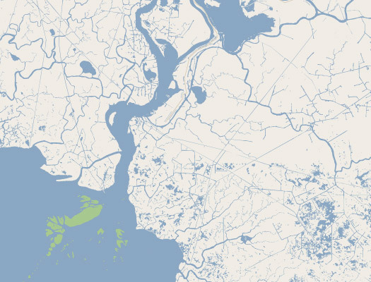 I've just spent the last half hour looking for the mouth of the Atchafalaya, following a corpulent blue squiggle, pixel by pixel, 170 miles from the Mississippi confluence to the Gulf. At close zoom, it's easy to get lost in southern Louisiana. The river splits a dozen times as it flows through the swamp, and twice I took a wrong turn, at Long Lake and Yellow Bayou. (These are labeled on the map, of course; you know you've lost the river when you find a place name.) No Atchafalaya.