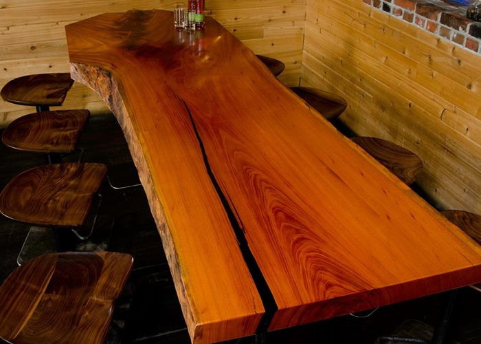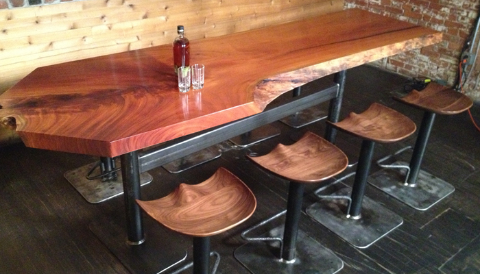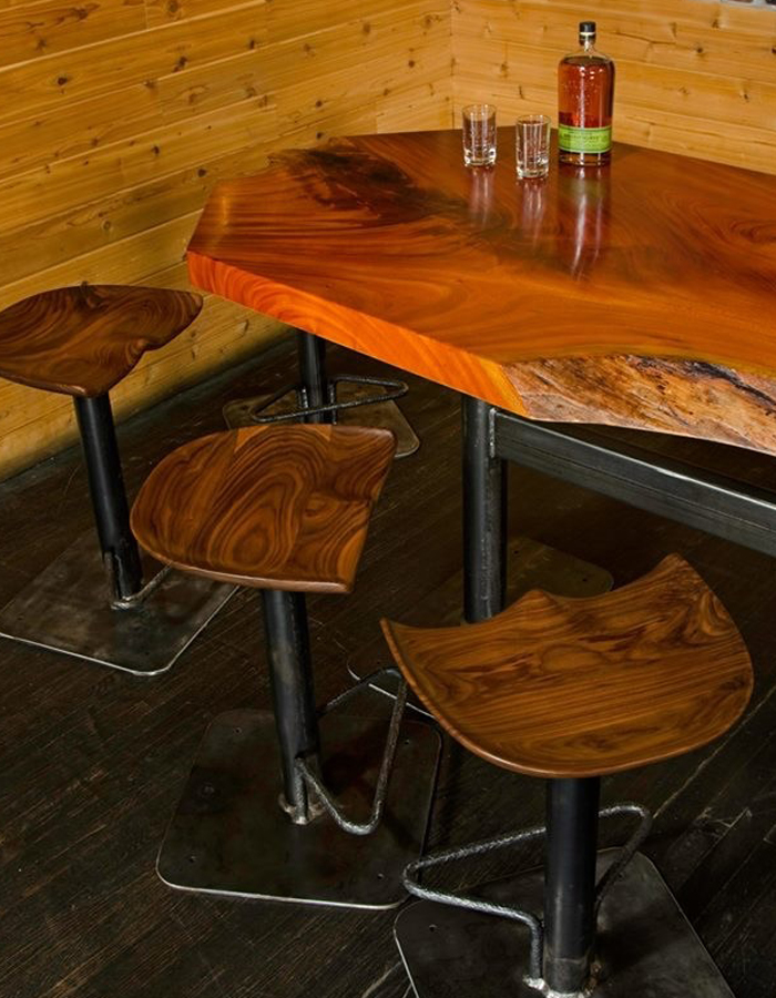 Contract Cruz Pedestal stools with live edge slab Mahogany community table.