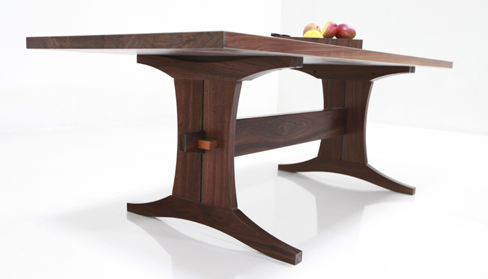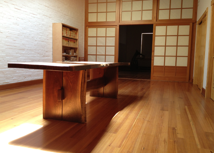 Corporate conference table with base framed in American Black Walnut with World War II surplus plank/solid Sugar Pine top (pine is aircraft grade and left for war production purchased at auction from Wick Pipe Organ Factory, 2011)