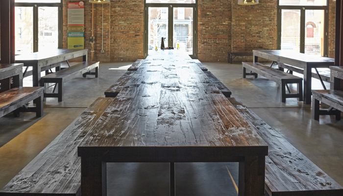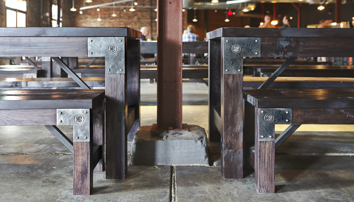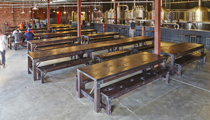 Goebel & Co. recently completed and delivered an order for eighty-four pieces of furniture to Urban Chestnut Brewing Co., a major brewing operation in St. Louis, as well as thirty-four pieces of furniture to Climate Corporation. The custom tables and benches created for Urban Chestnut are massive, heavy and nearly indestructible—the kind of tables and benches you would expect to find in a German-styled brewhaus.