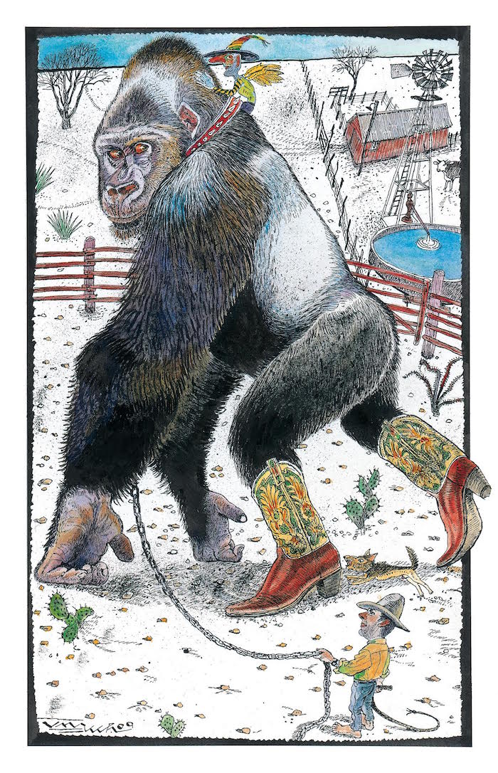 When I knocked on the door at Jack’s studio, a refurbished old house on Fairmont Avenue he shared with illustrator Bart Forbes and designer Jack Summerford, a voice from afar instructed me to show myself in and find my way upstairs. When I got to the top I spotted Jack, tall, bearded, and bespectacled, sitting at a short drawing table and he was erasing like his life depended on it. He was flushed and sweaty, with shards of rubber from his super-charged automatic eraser stuck to his face and arms. He called me over without looking up, and when I got to his drawing board I could see the fruits of his labor. He was erasing large chunks of an elaborate pen-and-ink drawing of downtown Dallas. Jack was clearly agitated. He had been drawing and redrawing the labor-intensive, bird’s-eye composition for weeks, his air-conditioner had gone on the fritz, the snake-bit project had fallen behind schedule, and the final piece was due in less than two hours—and now here was a damn kid pestering him to look at a student portfolio.