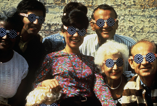 Deborah Sussman with fellow members of the Eames Office wearing July 4th glasses she designed (c. 1965)