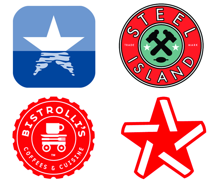 From top left: logos for River Systems Institute, Steel Island Drum Company, Austin-based Bistrolli’s, and Bookstar.