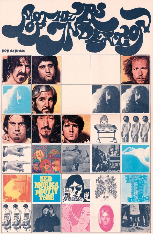 Here, to give the flavor, I’m showing several pieces of work from the 1960s and early 1970s by Mihajlo Arsovski, just one of several excellent designers featured in Kršić’s chapter. Arsovski wasn’t completely unknown to me; we showed a few largely typographical pieces in Eye way back in an overview of Croatian design. Only the intro to that article is available and I can find nothing substantial about him in English online. In 2011, a book about Arsovski was published in Croatia but, irritatingly, that isn’t sold by Amazon either, and I don’t have a copy. Kršić is working on a monograph of his own and he showed me some of his extensive collection of pieces by the designer. Arsovski’s work from this period combines pop culture references (see the wry Mothers of Invention album cover quotations in the Pop Express poster below) and a collage style with carefully composed structures in which everything locks together tightly; the typography has an exhilarating sense of playfulness, like a pictorial element in its own right, as well as visual drama.
