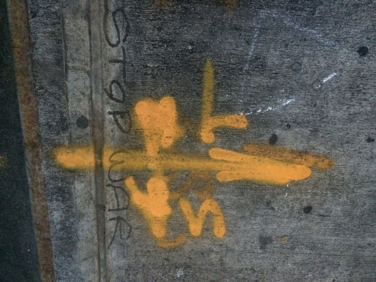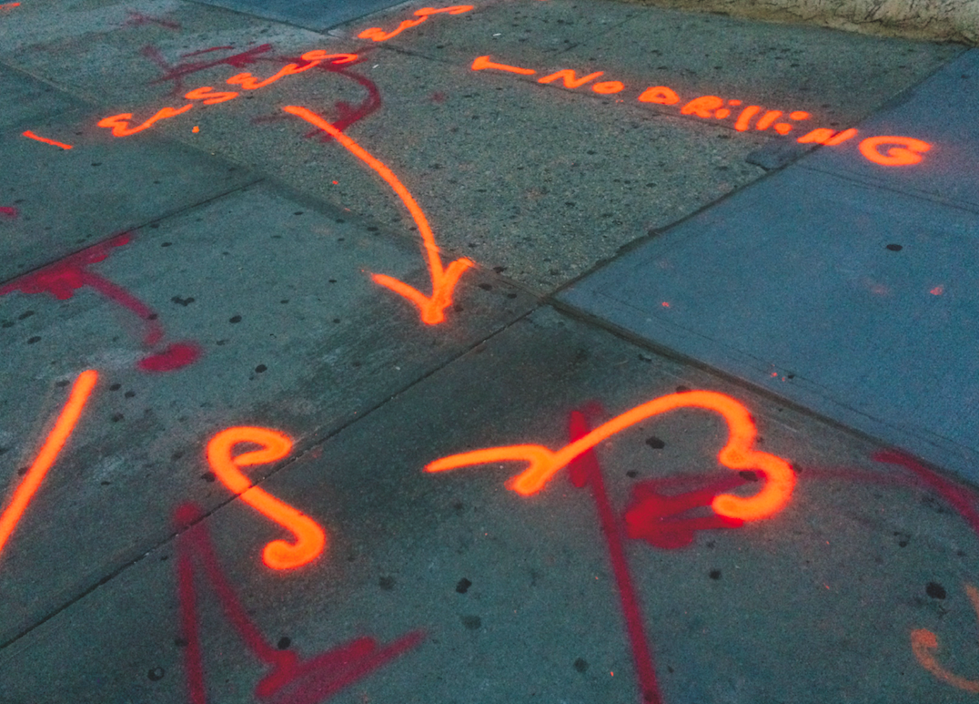 In addition to orange, there are two colors of this sidewalk tagging that suggest more imminent threats: yellow (for gas and steam lines) and red (for electrical cables). A former Con Ed spokesman, Chris Olert, calls these spray painted lines by their working name, mark-outs, and says that they are vital to the safety of the city. “You don’t want a backhoe hitting a 38,000-watt cable.” Before an excavation crew digs through the surface of the street they are legally bound to call a designated phone number which then coordinates with the utility companies to send out their mark-out crews, called locators, who mark out the utility lines and thereby delineate the spots where it’s safe to drill. It’s the equivalent of a human stud finding system.