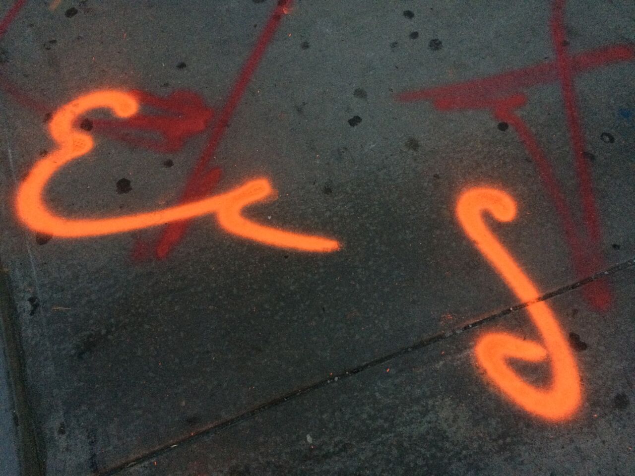 We’re standing on the corner of Edgar Street and Trinity Place. For weeks I’ve kept tabs on a dense hieroglyphics mysteriously taking shape. A manhole has sprouted a nimbus of red lines and the curb has been tattooed with yellow hash marks.
