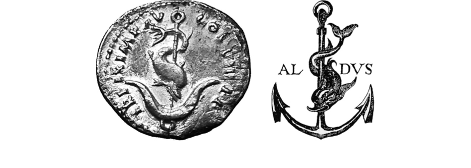 The image of a dolphin wrapped around an anchor that Aldus Manutius chose for Aldine Press is a visual metaphor for “Fastina Lente”—the Roman version of the classical Greek motto, which is often translated into English as “More Haste, Less Speed.” A silver medal of Vespasian featuring the dolphin and anchor, which was gifted to Manutius by Cardinal Pietro Bembo, was likely the inspiration for its adoption. The oxymoron in the metaphor cleverly captures the spirit of book production. Manutius, who understood and appreciated books from every angle, invented italic type, the portable octavo trim size, and was renowned for the quality of his craftsmanship. Numerous presses employed the dolphin and anchor after him, a testament to the suitability of his logo’s adage and his reputation for invention and precision. Examples include Antoine Tardif (est. 1584), Chiswick Press (est. 1787), William Pickering (est. 1820), and Doubleday (est. 1897).