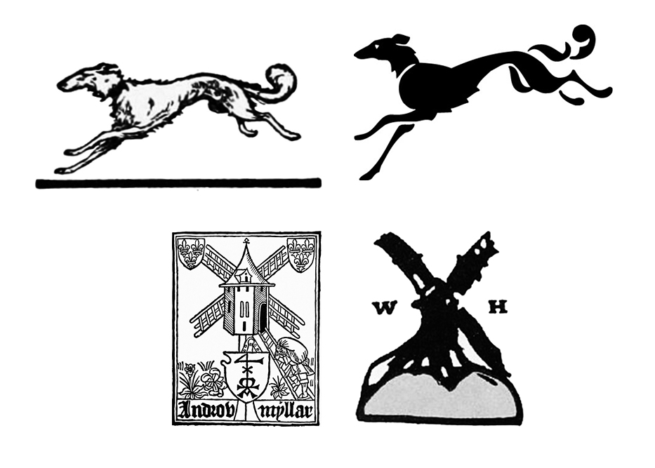 Wolfhounds aside, Knopf was mistaken about the lack of connection between windmills and books. Scotland’s first printing press—founded by Androw Myllar—also marked its books with a windmill. It was common at the time for printers to design their colophons in playful reference to their surnames , and Myllar meant “mill worker.” Perhaps Heinemann was aware of Myllar’s press and mark, but the windmill on his books was in fact a portrait of Beacon Mill in the village of Rottingdean, which was also home to William Nicholson, who—as Knopf speculates—was the artist behind the woodcut.