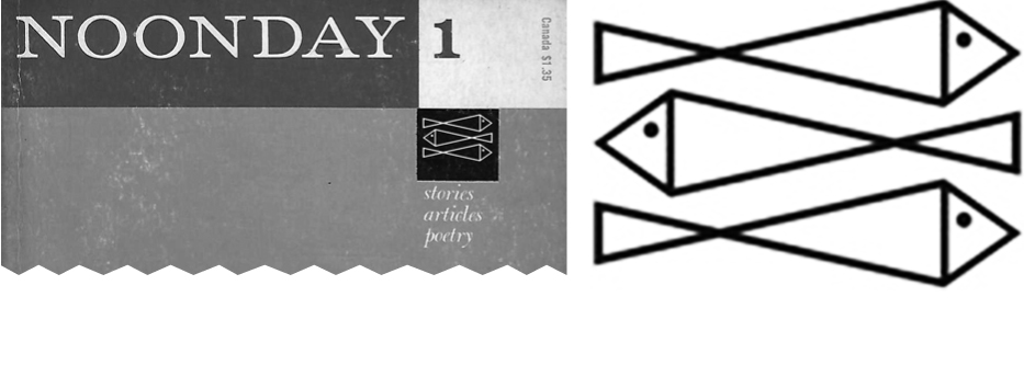 The three fish of Farrar, Straus, and Giroux were pulled directly from Noonday Press upon its acquisition in 1960. They had been employed on the cover of Noonday’s short-lived, self-titled literary magazine, which was edited by Noonday’s founder Cecil Hemley and published during 1958 and 1959 in the lead-up to the sale. The three fish were set above the same three words on the cover of each issue, “stories, articles, poetry.”