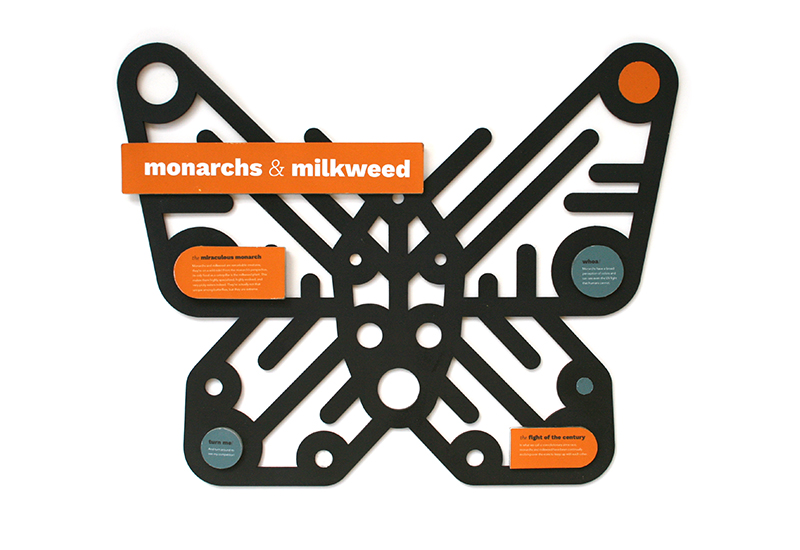 Interpretive Sign The exhibit also included outdoor, interpretive signage on the opposite side of the gallery. This particular sign showcases the interdependency of monarch butterflies and milkweed, whereby the body of the butterfly is built from a milkweed pod. Design by Julia Rater.