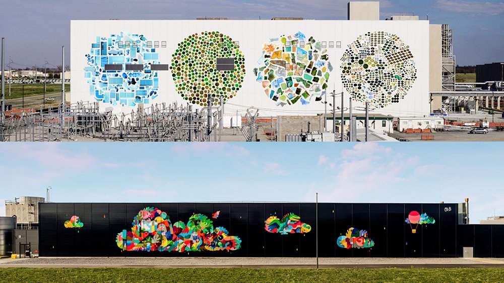 The Data Center Mural Project pairs artists with Google infrastructure. From top to bottom: Mayes County by Jenny Odell, St. Ghislain by Oli-B.