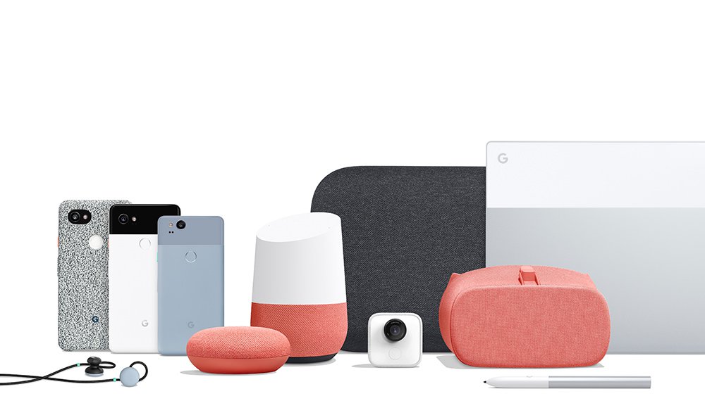 Hardware made by Google: Google Pixel Buds, Pixel 2 XL in a fabric case, Pixel 2 XL, Pixel 2, Google Home Mini, Google Home, Google Home Max, Google Clips, Daydream View, Pixelbook Pen, Google Pixelbook.