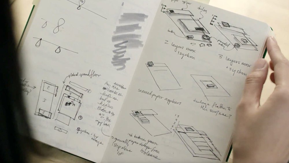 Early sketches illustrate the elevation system and visual layering used in Material Design. Still from "Making Material Design: Crafting Material" Youtube video, 2015.