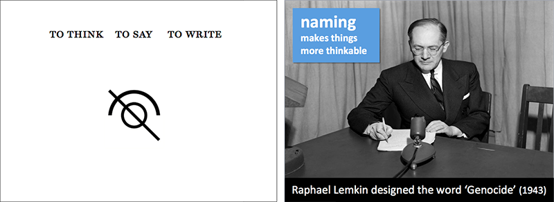 LEFT: Slide featuring Blissymbolics from Bryony Quinn’s presentation. RIGHT: Slide from John Wood’s presentation about the invention of new words.