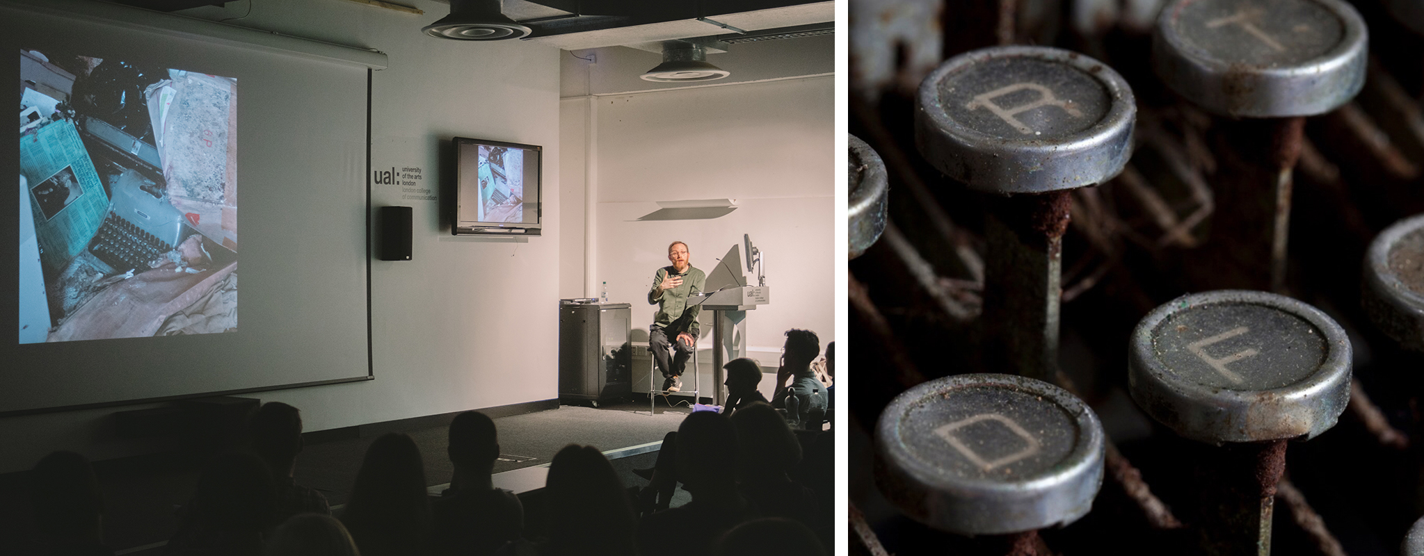 LEFt: James Langdon talking about Norman Potter’s objects. Photo: Gabriela Matuszyk. RIGHT: Norman Potter’s Lexikon 80 Typewriter at Le Bouchage, France (2014). Photo: Stuart Whipps.