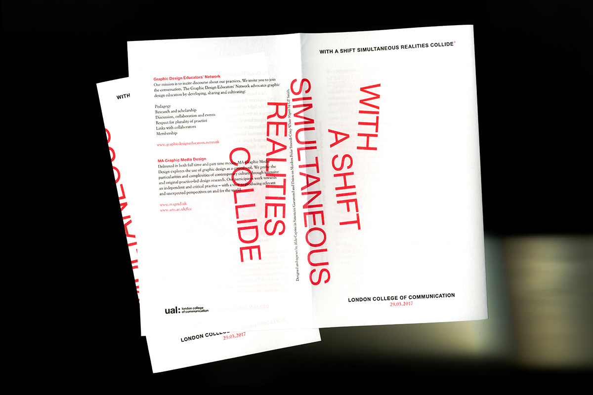 At the invitation of the Graphic Design Educators’ Network (GDEN), the MA Graphic Media Design course at London College of Communication, UAL curated and hosted With a Shift Simultaneous Realities Collide on the last Wednesday in March 2017. The afternoon event was organized by course leader and GDEN committee member Paul Bailey in collaboration with current full-time and part-time participants on the course. The event set out to explore the role of writing in/across/through design education and practice. The afternoon incorporated talks from Bryony Quinn, James Langdon and Professor John Wood; a series of workshops designed and delivered by MA Graphic Media Design participants; a special screening of a graphic design opera ‘No Exit’ from the Design Displacement Group; and a curated presentation of artefacts from the Archives and Special Collections at the London College of Communication, UAL. — The Authors