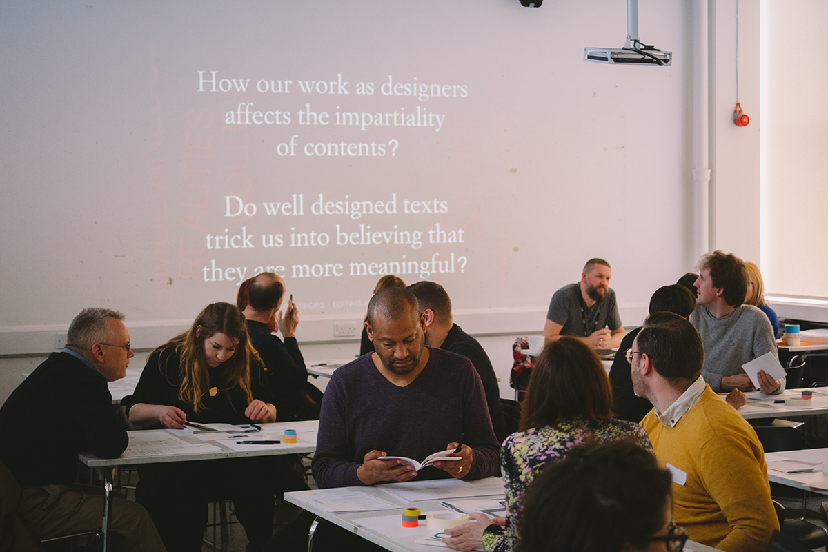 Notorious for ignoring the institution, Potter provoked questions on the role of forthrightness and equality, when honest feedback and constructive criticism is given from an educator to a student. We saw these very relationships manifest themselves and shift throughout the afternoon, as the participants ran a series of parallel workshops, challenging and interpreting different forms of writing within design research practices. Carlos Romo Melgar and Aldo Caprini, tested the role of designer-as-editor through a number of short exercises, all leading to the creation of a "Reader". That workshop explored graphic interventions in the editorial process as a legitimate collaborative writing method, which can unveil intertextuality between the contributions of each author. Questions on impartiality were raised during the session, as despite attendees being encouraged to rip and deconstruct given texts, they requested scissors for a more accurate edit. Does the form shape the legitimacy of the written word? Is the aesthetic a reliable measure of authority?
