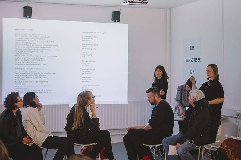 Louise Evans, Bec Worth and Cate Rickards illuminated the possibilities and peculiarities of transcription in their workshop "Original thoughts are prohibited". The attendees were invited to engage in exercises of listening, writing, transcribing, and watching. At first they were encouraged to move around the space and stand beside their chosen definition of the transcriber [the transcriber is: invisible, a conduit, an interpreter, an editor, an author, and a negotiator]. This movement opened the floor to debate and provoked collisions on the notions of ‘truth’ and ‘neutrality’. Similar in spirit to Kenneth Goldsmith’s Uncreative Writing, the workshop gave a purposely playful, contemporary proposition of transcription as a creative tool / writing strategy, relevant in the context of appropriation. As both Goldsmith and Potter show, in order to provoke and challenge traditional methodologies, teaching can at times be a "performance". After running their workshops, MA Graphic Media Design participants reflected on this, and noted the need for planning and intention, yet also the need for flexibility, and quick-thinking in their ‘shifting’ roles.