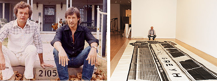 LEFT: Mason Williams (left) and Ed Ruscha (right), early 1960s. RIGHT: Mason Williams during installation of Bus, MoCA, 2007