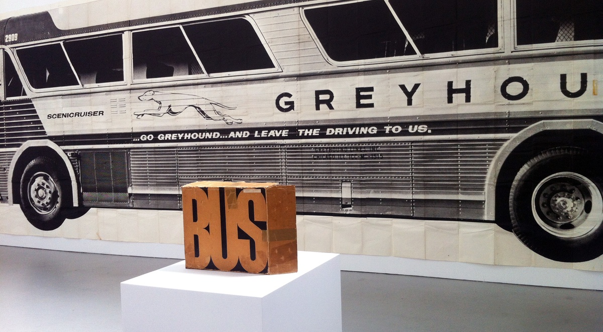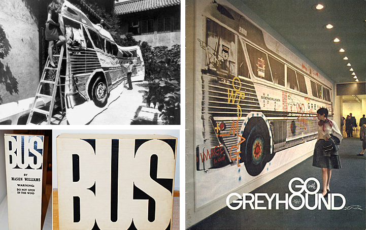 Bus during installation at Pasadena Museum of Art, August 1967; Cover, Go Greyhound, 1970. Photograph of installation of Bus at the Museum of Modern Art, 1968