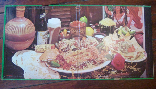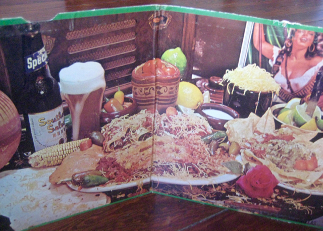 The image that takes up the entire Tres Hombres gatefold is a photograph of a ridiculously ornate meal from (now defunct, but once a sort of Houston institution) Leo’s Mexican Restaurant, photographed by Galen Scott. While some of the huzzahs for the Micklethwait/ Bessenhoffer effort describe the image as “mouthwatering” and so on, I would politely suggest that this is misleading. Even as a kid in a far more naïve era of food-health thinking, this meal looked to me like a borderline-surreal gut-bomb—a culinary dare.