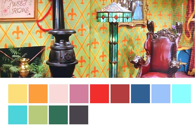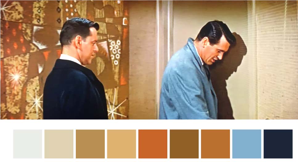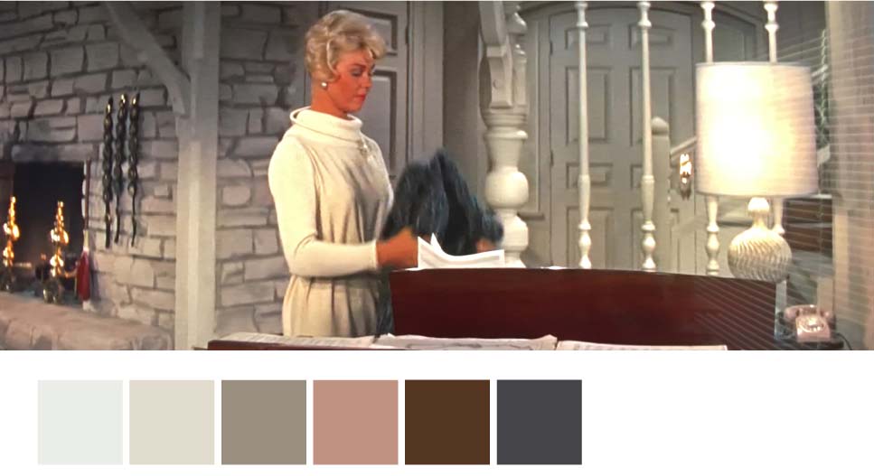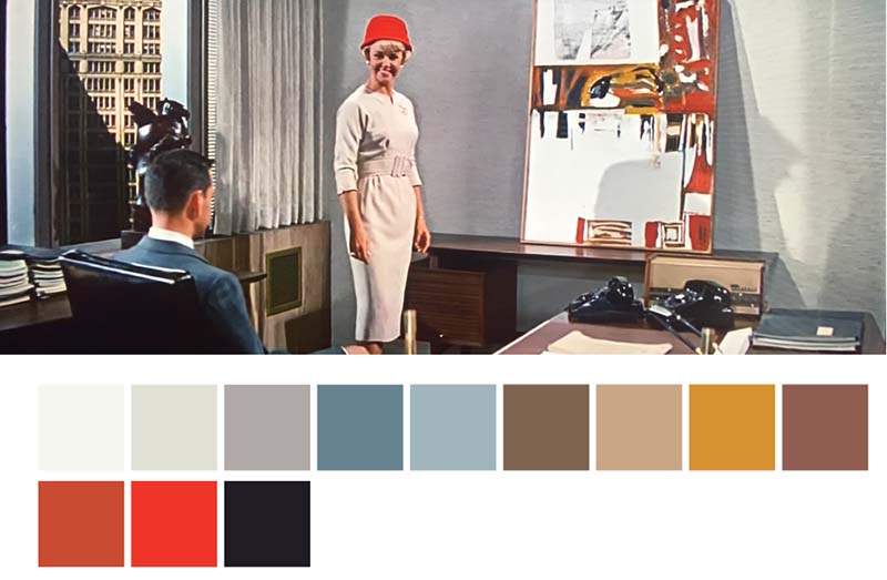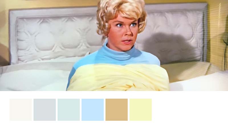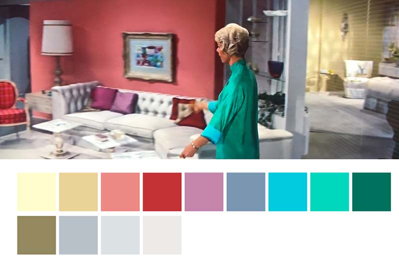 And most recently, I deconstructed the palette from Pillow Talk (1959). I simply used my phone to snap images from the television. The color in Pillow Talk has the saturated and upbeat attitude of the late Eisenhower years. The palettes are clear, pure, simple, and optimistic. Like the plot of the film, the colors align with a light romantic comedy.