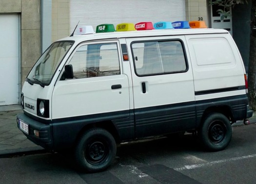 The signs on the small van describe the services it supports: Taxi; Pick-up; Delivery; Assistance; Vendor; Security; Rental.