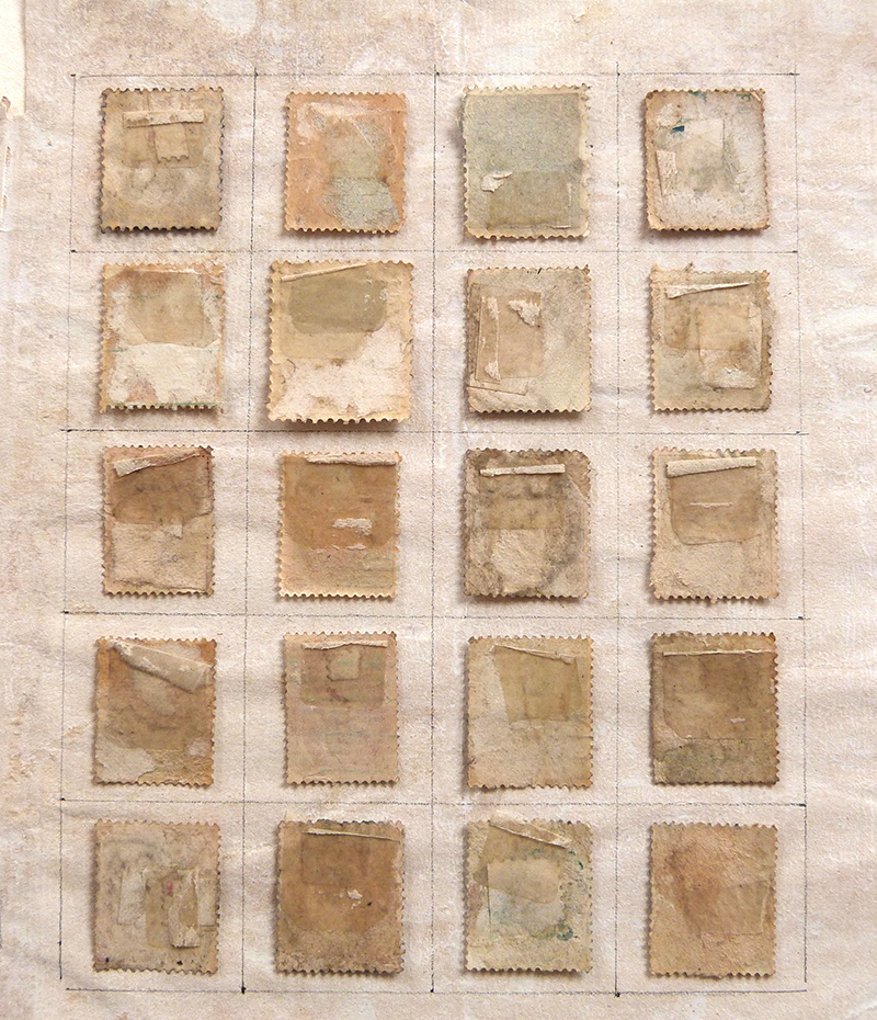 A good example is the project titled ‘A Foreign Country’ - I collected postage stamps when I was a boy - an early fascination with collisions of image and typography - and a few years ago began a long process of re-visiting my childhood collections, reversing all of the stamps and mounting them face down on hand-drawn gridded pages. This process followed a pattern I’d established back in the 90’s of reversing printed material, sometimes using the reverse as a surface to make images on, as in the projects made with maps, but also as an act of erasure - with the postage stamps I wanted to hide all references to countries, currencies, politicians and monarchs, and focus on the simple collector’s obsession with arranging pieces of paper on a gridded surface. At the same time it became a personal meditation on family, and memory, and loss.