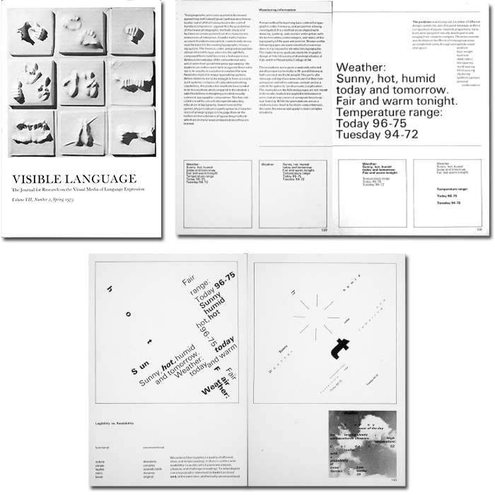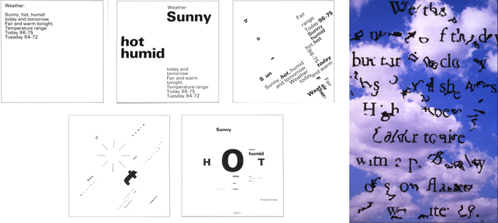 In another he started with a bland message—in this case, a weather report. He asked his students to experiment by gradually making the message dysfunctional, an odd idea in the modernist mindset. But it had to do with his notion that typography (and other kinds of visual messages) had two dimensions: legibility (Can I read it?) and readability (Am I interested in reading it?).