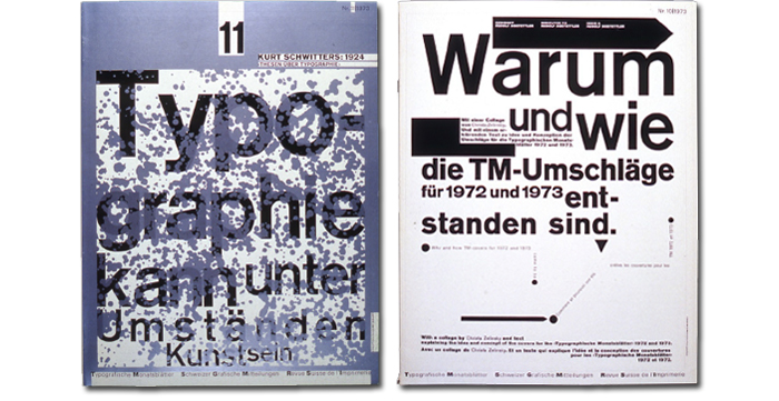 Meanwhile, Wolfgang Weingart, Dan’s former teacher in Basel, had also been perfecting his own experiments with a “new typography,” and around the end of 1971 we began to see issues of TM, the magazine of the Swiss typographic industry, with amazing covers that he had produced. They had a kind of energy and fascinating formal logic that felt invigorating and naughty.