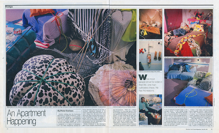 In an essay in Dan’s book, educator and curator Steven Holt had this observation: “As Friedman began to pursue projects of personal meaning rather than professional interest at the end of the 1970s, his life increasingly took on the dimensions of an experiment rather than a career.” Nowhere was this more obvious than in his apartment, a nondescript, one bedroom on the 15th floor of Two Fifth Avenue. For over a decade, beginning in the late '70s, he transformed, almost daily, this domestic space into a laboratory for experimentation with color, form, materials, and meaning.