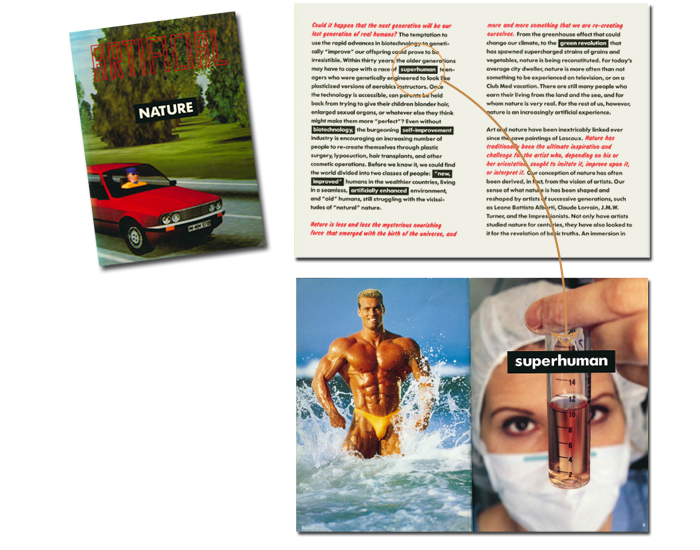 During this period, Dan was able to bridge his fields of design and art through a series of publications for the gallery owner and curator Jeffrey Deitch. For two different shows—Artificial Nature and Post Human—Deitch invited Dan to create visual essays that served as an introduction to the exhibitions. Dan parsed Deitch’s essays, isolated key words and phrases, and then paired them with provocative images that he researched. These juxtapositions were full of irony and energy, bringing a new level of meaning to Deitch’s words, a testament to how tuned in Dan was, in his new life, to the images, art and ideas of popular culture.