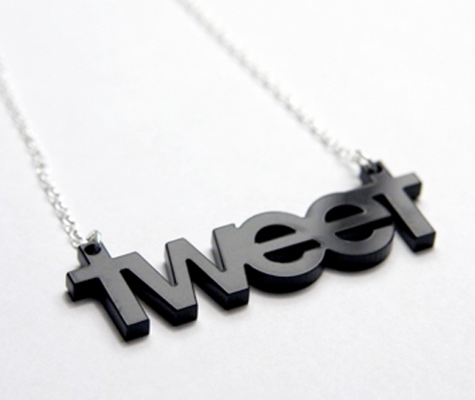 Some of the examples I’ve taken note of involve characters from video games and the like, but that doesn’t seem particularly different from a Mickey Mouse doll or a Hello Kitty bracelet. I’m more interested in the stuff with no personality at all, referencing the most banal symbols of the screen world (like this pillow with the RSS icon, by Craftsquatch) or even attempts to capture the stuff of digital life that isn’t particularly visual at all (as in this somewhat silly necklace noticed by On The Ground Looking Up, from plastique, featuring the disconcertingly large word “tweet”).