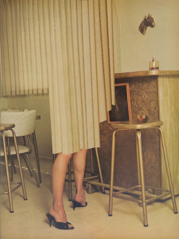 The location is uncertain. It might be a living room or it could be the corner of a bar. Either way, a cocktail stands ready for drinking on the stool. From the interior styling and the mustardy cast of the color, the source must be a vintage picture. But this is clearly also an image that has been manipulated, since the extension of the drape to conceal most of the woman makes no spatial sense—if the fabric were a continuation of the curtains, then it should fall behind her.