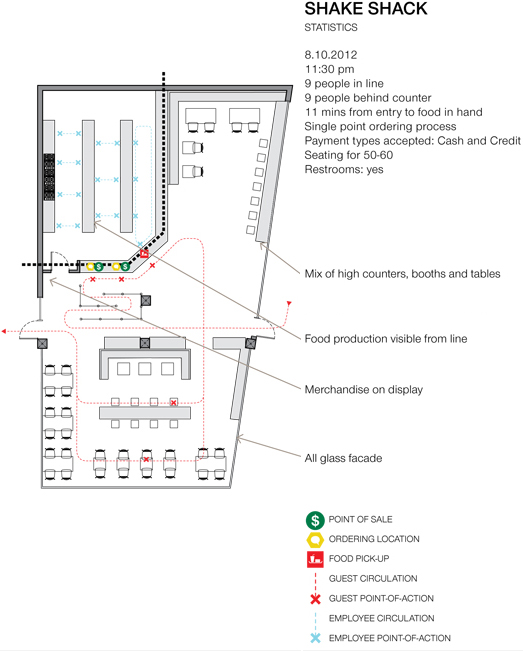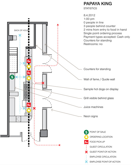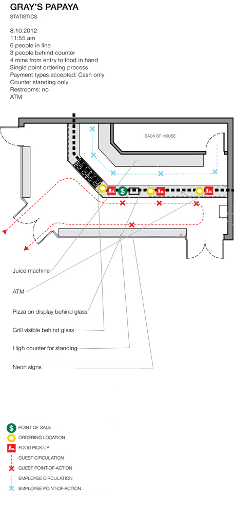 How do you design an outpost of a legendary fast-food joint without losing its character? For that matter, what are the design challenges inherent in the design of any quick-turnaround restaurant? Papaya King's architect, Andrew Bernheimer, took a rather analytical approach to these problems. Reproduced in the following slideshow are diagrams made by his office after careful examination of a series of New York dining institutions and other fast-food restaurants, from Katz's to Shake Shack to Joe's Pizza. Following the slideshow is an interview with Bernheimer, in which he discusses what, exactly, they learned from this exercise.