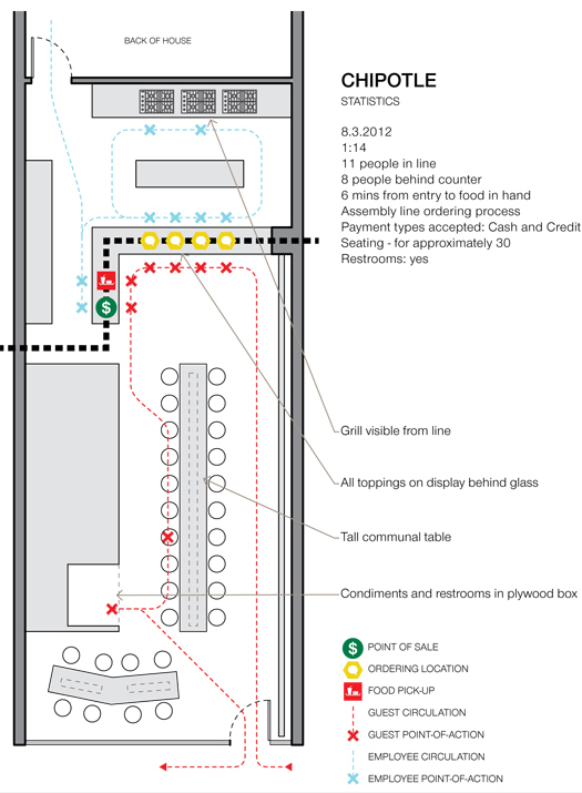 AB: They stuff you with calories. More seriously, there is certainly a play of desire for efficiency (serve as many as fast as possible, e.g., Gray’s Papaya, no atmosphere other than paper pineapples) with a desire for environment (newfangled places like Shake Shack and Chipotle, who want to serve as many as possible as quickly as possible but which also value design). Also, linearity. Lines. Tracks. Paths. Don’t wander. Get in line. Get out of line and eat.