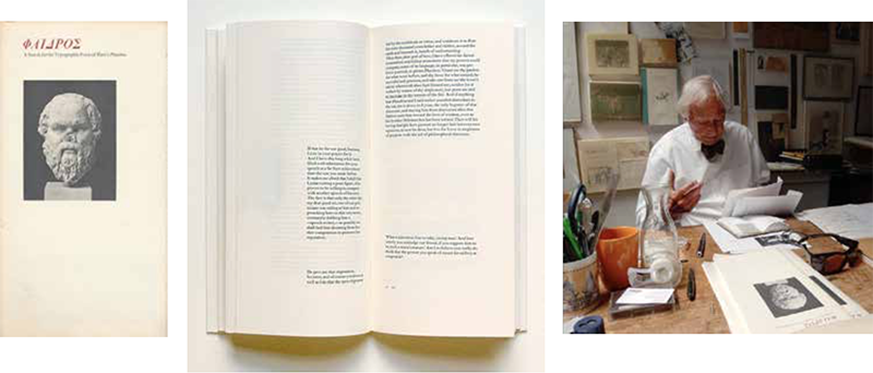 His beautiful PHAEDRUS, published in 1977 after years of study, explored the typographic potential for expressing the dialog between two speakers. In 1991 came the elegant translation of the Horace Odes; and then in 1999 he published A Typographic Journey, his remarkable personal history of the Greenwood Press, 1934 – 2000.