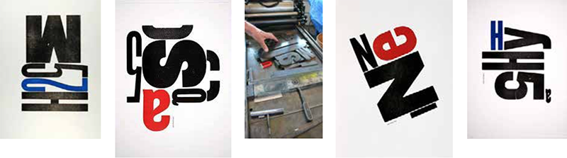 Parallel to his calm and elegant book design was another more playful outlet. Over many years he experimented with compositions made from some old wood type he acquired when he moved into 300 Broadway.