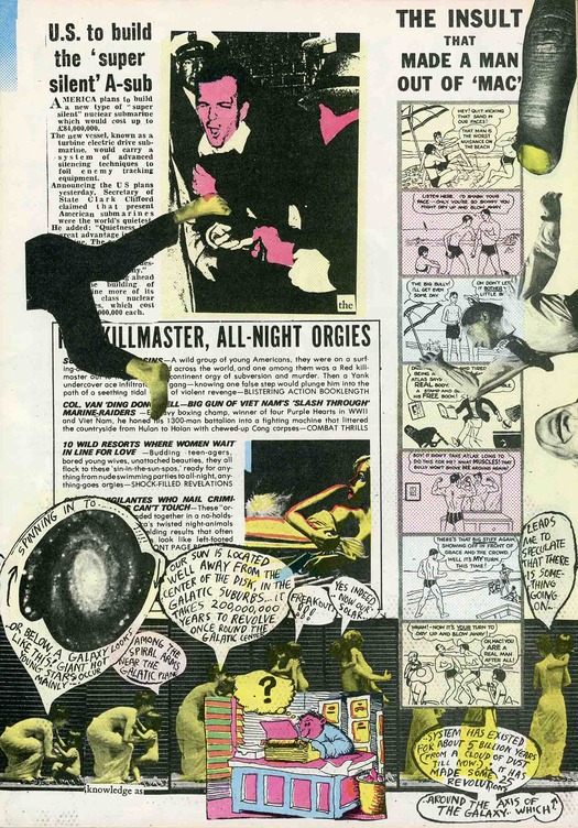 Over the years, this prodigious 48-page volcanic lava flow of collage has received admiring mentions — I have written about it myself in Design Without Boundaries — though mainly from those who experienced its full impact on publication, since it’s now so hard to see. The radical writer David Widgery, who contributed to Oz, dubbed it, “the one thing created by the psychedelic era which might be looked at with interest in 100 years’ time.” The late Robert Hughes, art critic, was also impressed. Casting aside any conventional notion of magazine content and structure, dispensing even with the editors, Sharp and an assistant performed a demented Frankenstein suture-fusion of purloined images of news stories and headlines, small ads, comic books, Hollywood movies, bodybuilders, starving children, John and Yoko, Chang and Eng, Eadweard Muybridge, Winsor McCay, Max Ernst, René Magritte, and Robert Crumb. There is a speech-bubble running commentary from Sharp, quotations from Shakespeare — “It is a tale told by an idiot, full of sound and fury, signifying nothing” — and Tiny Tim is in there somewhere, too. The magazine remade as a theater of everything.