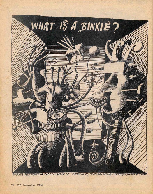 Martin Sharp, ad for Binkies Beef Burgers, back cover of Oz no. 31 (Sydney), November 1966
