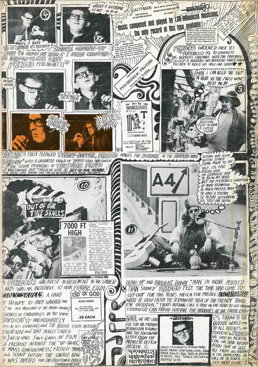 Sharp continued his editorial interweaving of word and image in the first issue of the new Oz in February 1967, which he announced with a leering toothy mouthpiece — in a photo in Neville’s 1995 memoir Hippie Hippie Shake, taken soon after they arrived in London, Sharp holds a similar cutout mouth on a wire in front of his own. At the back of the issue is a three-page fold-out section by Sharp devoted to a hippie-fied photo-strip with collage elements, inky embellishments and lengthy handwritten captions, titled “The Somewhat Incredible Turning on of Mervyn Lymp, Bank Clerk.” (See the back cover above.) The densely composed strip anticipates the even more violent collision of word and image that would follow, two years later, in Sharp’s “Magic Theatre” issue.