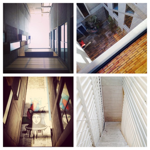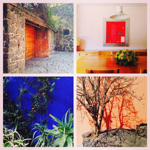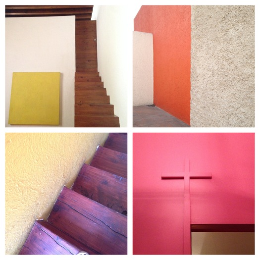 Pictures of the houses of Luis Barragan tend to focus on the colorful moments, as I have in the rainbow collages above and below. But the white walls, and the windows on to sky and garden, are equally important. Barragan isn't trying to overwhelm you (as Ricardo Legorreta does at the Camino Real), but to get you through the day, in the house, with a series of views that surprise and delight. In his own home, each room is shaped to a particular activity and time of day. The pink cross is built in over the door of his solo breakfast room, to offer a wordless blessing. The sunshiny Albers painting is set next to a two-story window, providing an alternative sun on a rare cloudy day. At Casa Prieto, a tree with flame-like flowers grows out of a rock in front of a coral wall, emphasizing its heat from the cool of the aqua pool. Contemporary architects can't help but pay homage. I visited the clever, elegant Lisboa 7, designed by at.103, and found those murals tucked into slots. There, the hot colors are reserved for the sunken garage, flashes of orange through a block wall, common storage in lime. Upstairs, the palette is paler, allowing residents to create their own Barragan moments, or not. In the apartment we visited, the walls were gray and the rainbow palette provided by a collection of California pottery. It was fun to recognize an old friend, transformed by geography into a different reference.