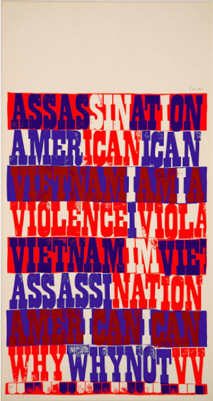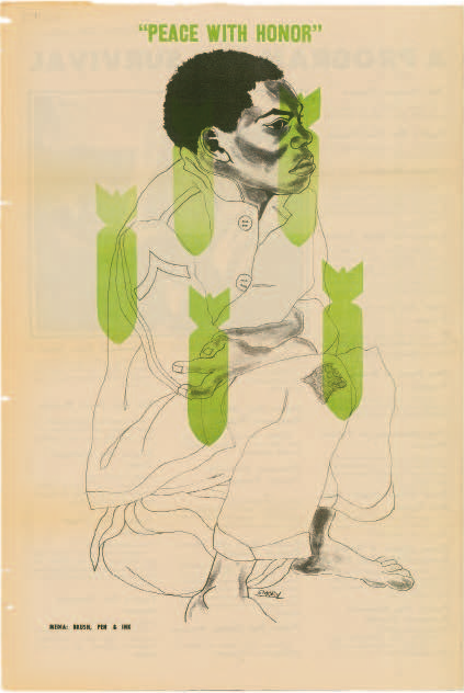 Douglas’s oeuvre was that of a “revolutionary artist,” an identity the Panther leadership declared for him and one that artist Sam Durant acknowledges in comparing Douglas to the Russian Constructivists, artists and designers committed to social and political reform. With a goal of ending “global capitalism and imperialism,” the Panthers saw themselves as aligned with a worldwide revolutionary movement that equated U.S. government–mandated aggression at home, against its black community, with U.S. aggression overseas in Vietnam. “Peace with honor” quotes a 1968 Richard Nixon campaign promise; once elected president, he intensified American involvement in the war.