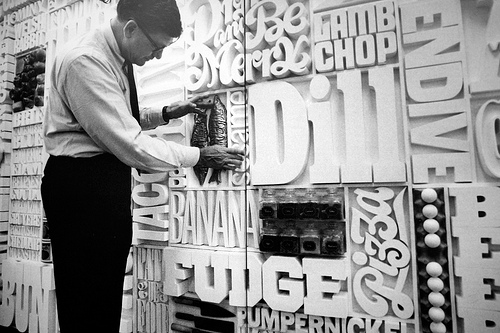In contrast to the eclectic approach Dorfsman took to the design of the network's outward-facing advertising and promotional material, the graphic standards at headquarters were almost obsessively rigorous. Dorfsman commissioned two new fonts from Freeman Craw, CBS Didot and CBS Sans, and these were deployed everywhere throughout the building, including door numbers, elevator buttons, and wall clocks, 80 of which had to be dismantled and reassembled with new faces installed. Dorfsman's typographic eclecticism reemerged in his career tour de force, his solution for a 40-foot-long blank wall in the corporate cafeteria. There he collaborated with his longtime friend Herb Lubalin to create an all-type, three-dimensional collage combining words related to food and culinary paraphernalia into a relief sculpture that was dubbed the "Gastrotypographicalassemblage." A combination of enthusiastic excess and clinical precision, the wall was hailed as Dorfsman's ultimate achievement. But I must confess, I am just as impressed — if not more — by the fact that he convinced the NYC safety authorities to allow him to use the elegant (and definitely non-code compliant) CBS Didot font for the building's fire exit signs.