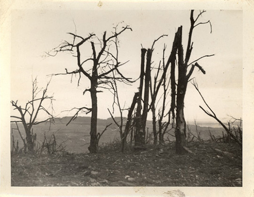 His solution was to gather notes, visual notes. Wielding his Leica like a notebook (he was not a trained photographer) Bromberg went about gathering details, photographic images that he envisioned using later in his paintings: the twisted forms of the German defenses, the skeletal outline of blasted trees against a blank sky, the contorted body of a dead German soldier. “I was thinking pictorially. I was thinking not just about the subject matter but also what was evoked.”